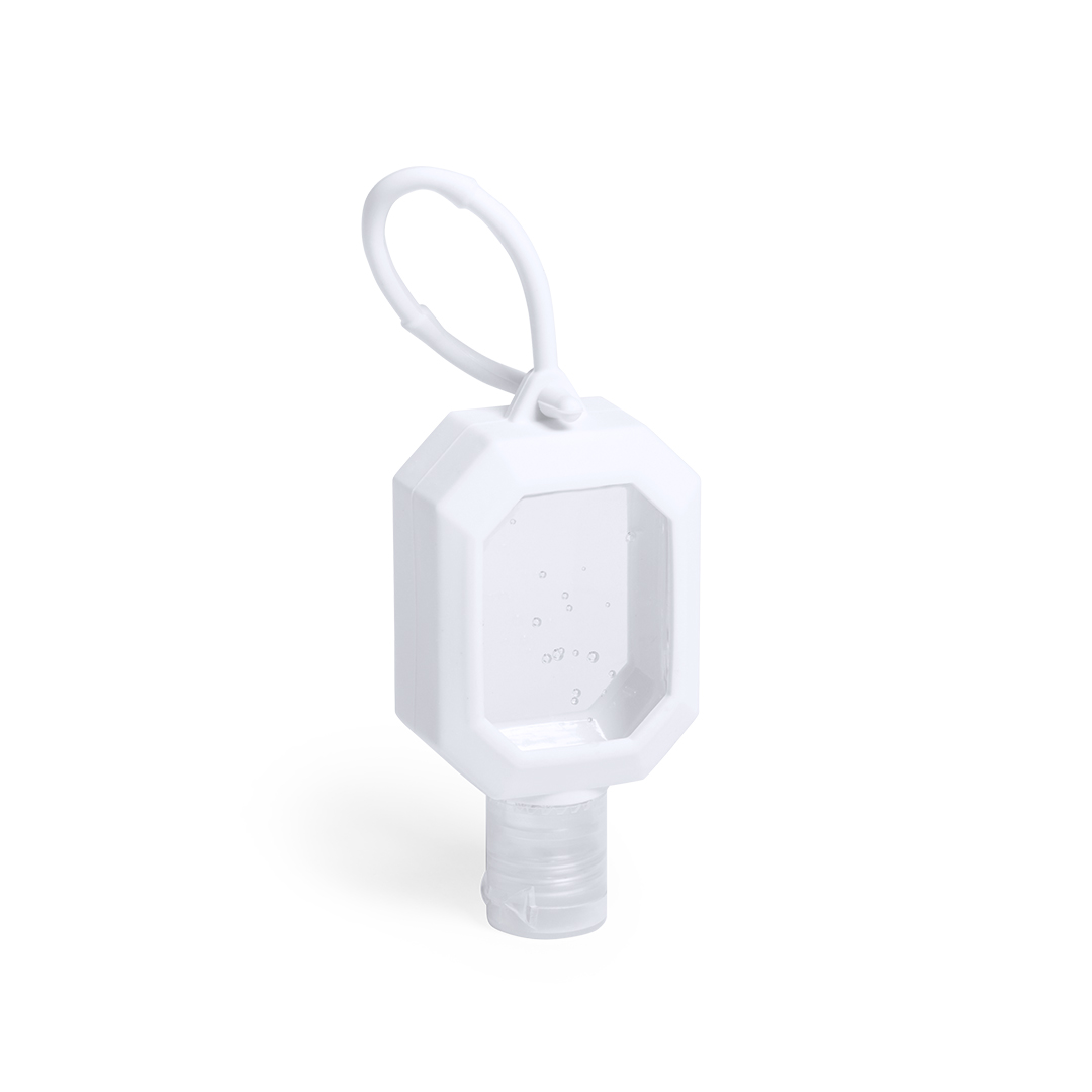 Gel hidroalcohólico para higiene y limpieza de la piel en bote rellenable de 30 ml, con extracto balsámico de Aloe Vera. Cuerpo en suave silicona de color blanco, con dosificador, tapón de seguridad y cordón en mismo material para transporte / fijación. Solución con 65% de contenido de alcohol.